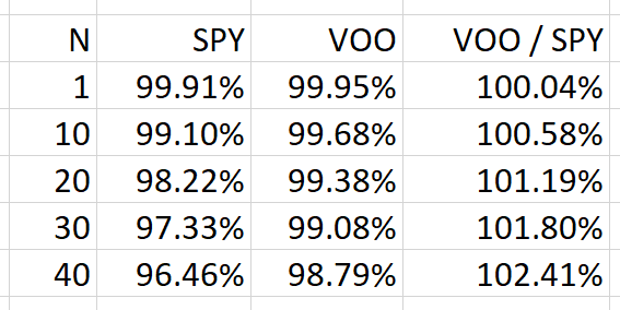 • VOO: X * P * (1-0.01%) * (1-0.03%)^N * (1-0.01%)