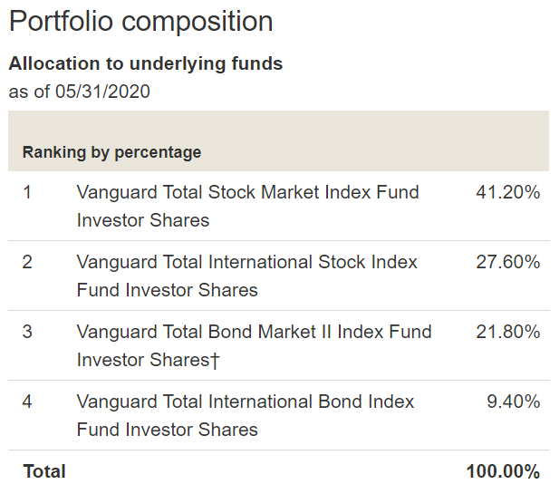 LifeStrategy Funds 也是用同樣的四種資產,根據想要多積極而決定是 20%、40%、60%、80% 股市,而跟 Target Date 的差別是,這個的資產比例是不會隨著時間改變的。