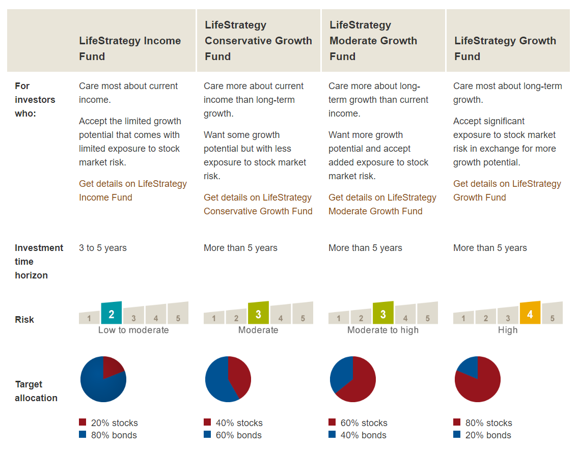 最具代表性的是 Vanguard 的 Target Date Funds 跟 LifeStrategy Funds,這兩個其實大同小異。