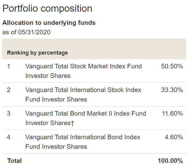 Vanguard 的策略是 core four,使用以下這四種 ETF 或是對應的 funds 組成自動幫你平衡的 fund of funds: