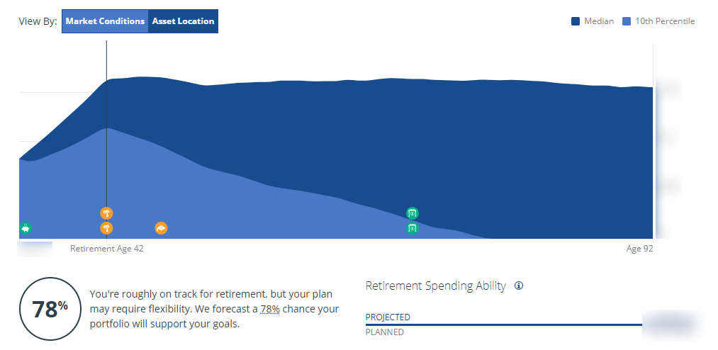 Our Retirement Planner runs 5,000 Monte Carlo simulations to deliver a robust, personalized retirement projection. The simulations incorporate expected return and volatility, annual savings, income, spending goals, retirement spending, social security, and tax rules for taxable, tax-deferred, and tax-free investment accounts.